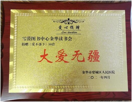 金华读书会的同学安朵国际董事长王勇财分享说:在企业里,文化就是企业的命脉,文化也是一个企业的格局的展现,“爱不落下”书里面描述的信念,信心,大爱,奉献,其实也就是企业的文化精髓,很高兴能来到医院和大家一起共同学习。分享会结束之后,就进行了捐赠仪式,由金华读书会向金华婺城人民医院捐赠雪漠作品“爱不落下”50套。医院的徐书记给金华读书会回赠了爱心证书。