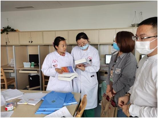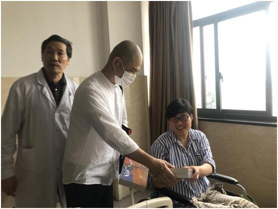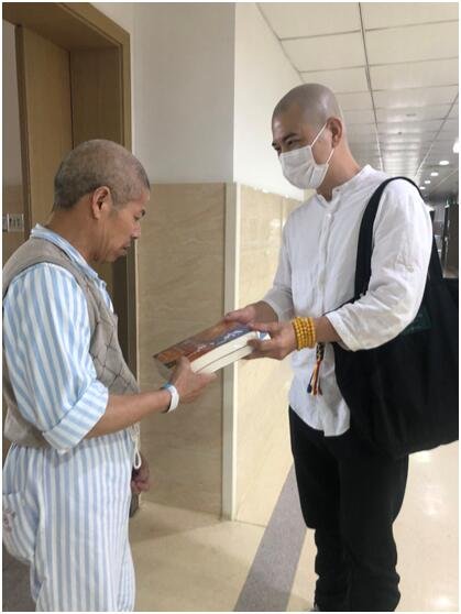 捐赠仪式后,医院的领导与方医生和读书会的同学,大家带着《爱不落下》来到住院部,分别向几个楼层不同科室的医护人员及住院病人介绍及捐赠图书,获赠的医生及病人表示一定要好好看并表示感谢。