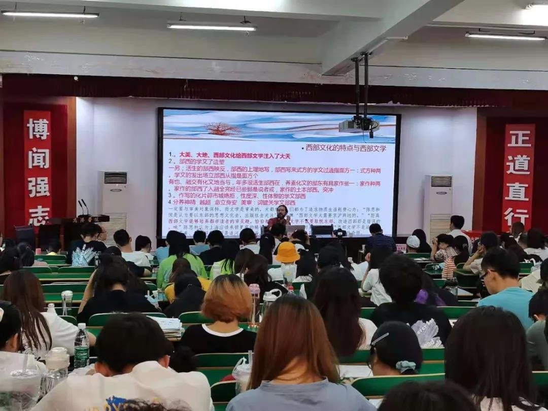 6月11日活动比较早,八点就开始了,因为时间紧迫,前一天下午马院长就加急制好了宣传展牌,放在了商洛学院的正门,对着的人文学院的门口,醒目的主题《西部文学的自觉与自信》雪漠老师络腮胡红上衣的典型形象,还有简介。这次活动是雪漠作品捐赠暨学术讲座,由商洛学院人文学院和商洛市图书馆主办,参加的有汉语19级和20级的部分学生,陕西省商洛市文联党组书记、主席王良;中国作家协会会员、商洛市作家协会主席雨在洋;中国作家协会会员、商洛市作家协会常务副主席、商州作协主席王卫民。还有人文学院院长、商洛文化暨贾平凹研究中心主任张文诺教授;商洛学院图书馆馆长黄新春;商洛市图书馆馆长彭萍莉;商洛职业技术学院图书馆馆长张维;商州区图书馆馆长席明,共200多人参加。
