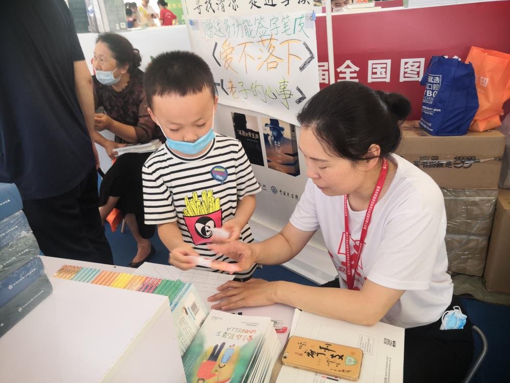 书博会适逢暑假期间举办,场地又临近烟台市少年宫和烟台大剧院,带孩子前来购书的家长们占了主流。在《母狼灰儿》和《一个人的西部 致青春》这两本特别适合青少年的作品缺席展会的情况下,老师们决定以《老子的心事》为突破口,从家庭教育以及传统文化熏陶等角度,结合书中内容重点推荐。效果十分明显,《老子的心事》第一、二辑都在第二天全部售罄。