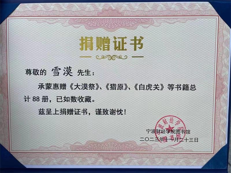 2023年11月23日下午2点,宁波雪漠读书会带着雪漠作品走进宁波财经学院,并举办了捐赠仪式,建立“雪漠作品专柜”。