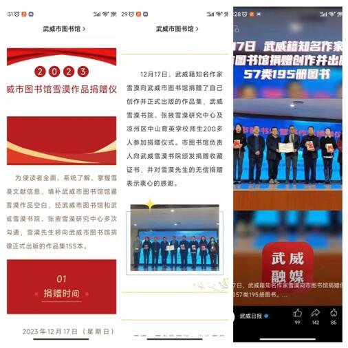2023年入冬以后,河西第一场大雪之后,气温骤降至零下20度,但依然挡不住武威市民的求知欲望。12月17日,武威市图书馆举办了一场意义非凡的活动——雪漠作品捐赠活动,吸引了200多名年轻一代的学生、市图书馆的读者及社会各界人士参加。