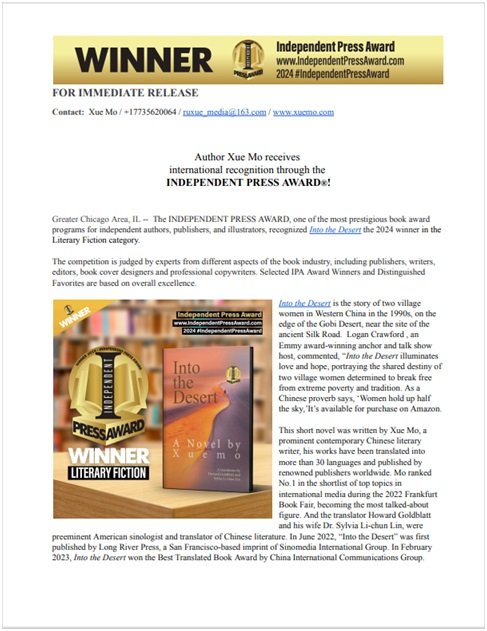 2024年2月26日,美国“独立出版奖”协会宣告美国华媒国际集团长河出版社出版的中国作家雪漠代表作品Into the Desert(中文名《沙漠的女儿》)荣获2024年文学小说类“独立出版奖”。 该奖项专门为全球作家、独立出版商和插画师设计,是全美最负盛名的图书奖之一。