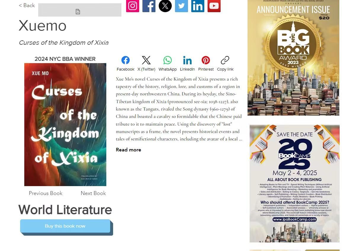 美国“纽约市图书大奖”组委会公布了中国作家雪漠的代表性作品英文版《西夏咒》(Curses of the Kingdom of Xixia),由Fan Pen Li Chen翻译,纽约州立大学出版社SUNNY PRESS出版)荣获“2024纽约图书大奖”(2024 NYC BIG BOOK AWARD)金奖,西夏咒》已经被翻译成英语、意大利语等多种译文版本。