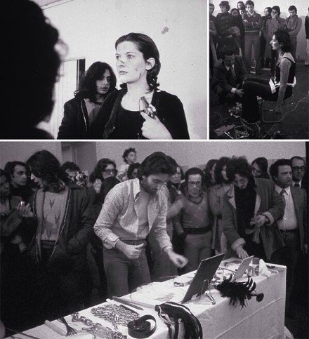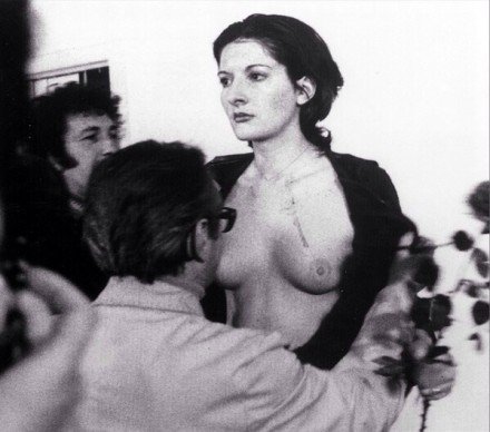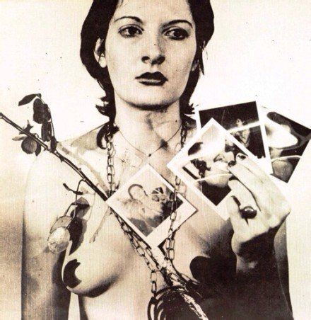 “行为艺术之母”——玛丽娜·阿布拉莫维奇,1974年在意大利那不勒斯表演的“节奏系列”终结作品《节奏0》。玛丽娜麻醉自己面向着观众站在桌子前,桌子上有七十二种道具(包括枪、子弹、菜刀、鞭子等危险物品),观众可以使用任何一件物品,对她做任何他们想做的事。