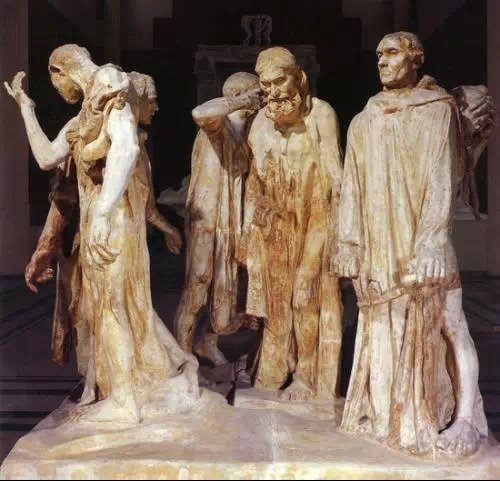 再举一个例子,如《加莱义民》。加莱是法国北海岸的一个城市,1347年英王爱德华三世围城,下令城中选出六名士绅领袖,露顶赤足,穿上麻衫,颈系绳索,持城门钥匙,出城投降就刑,否则将屠城报复。士绅中有六人自愿牺牲自己以救城中百姓。据记载,怀孕的英后在场,恳求英王放了六人。罗丹要表现的是这短短的行列走向殉难的情景,六人中,或迈出毅然从容就义的步履,或痛苦踌躇不前,有人回盼,有人苦思。这和英雄纪念碑的体例是大相径庭的。罗丹要在这历史事件中,刻画出个人的内心斗争。他甚至主张取消基座,让悲剧中的人物就走在观众的近侧,使观众能感受到他们的心的颤动。开初,加莱市的审查组看到初稿,提出批评说,这些人物损坏了他们心目中的爱国英雄的形象。但最后,他们知道错了,他们期待一座公式化的英雄偶像,罗丹给他们的是更真实的史诗。