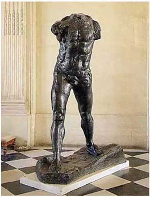 欣赏罗丹毕生的作品,我们也就鸟瞰了人的生命的全景。从婴孩到青春,从成熟到衰老,人间的悲欢离合,生老病死,爱和欲,哭和笑,奋起和疲惫,信念的苏醒,绝望的呐喊……都写在肉体上。罗丹的人体不但留下岁月与苦难的痕迹,而且往往是残缺的。在他之前,哪一个雕刻家曾展出过孤零零的一只手?而他雕塑的一只手,如一株茂盛的树,充满表现力,成为“神的手”。两只手合拢来,十指如柱,指尖相接,成为“大教堂”。《行走的人》只有断了的躯体和迈开的两腿,连手臂也删去,面部的表现也成多余。走向前路,是带着振奋?是带着忧虑?是乐观?是惶恐?也许都有吧。那是人的步伐,是全人类的步伐,是全宇宙的步伐。“天行健!”一个中国人心里会跳出这古老的《易经》里的句子。不纪念任何特定的人物的巨像,而它走在宽阔浩翰的地平线上,带着无比的动量,带着历史的斑驳,并无所欠缺的残缺,在我们记忆中烙下棒喝的印记。