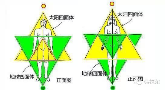 上图是女性的梅尔卡巴Merkaba, 男性四面体的角度刚好180度相反