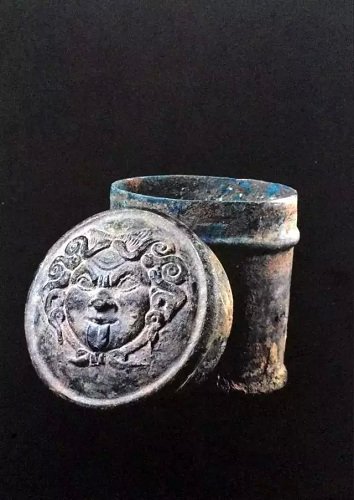 ▲油膏盒盒盖上装饰着蛇发女妖戈尔工的头像
