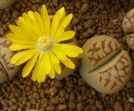 在非洲南部及西南部干旱而多砾石的荒漠上,生长着一类极为奇特的植物——生石花。两片肉质叶呈圆形,简直就像一块块半埋在土里的碎石 块。这些“小石块”呈灰绿色、灰棕色或棕黄色,有的上面镶嵌着一些深色的花纹,如同美丽的雨花石,有的则周身布满了深色斑点,就像花岗岩碎块。这些“小石 块”不知骗过了多少旅行者的眼睛,又不知有多少食草动物对它们视而不见。每年的冬春季,这些“小石块”都会绽放出绚丽的花朵,一片片的生石花覆盖了荒漠, 特别好看。然而当干旱的夏季来临时,荒漠上又是“碎石”的世界了。