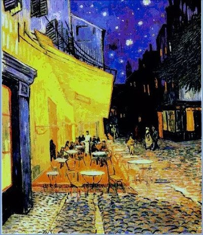 阿尔勒另一个跟凡·高相关的地方,就是《夜间露天咖啡馆》里的那个已更名为“凡·高咖啡馆”的小店。这个地方离市政府不远,在一个小巷子里。当年凡·高常在这里买便宜的苦艾酒借酒消愁。他曾在给小妹的信里提到这幅画:“上面是布满繁星的深蓝色天空,咖啡馆墙上黄色提灯照亮了旁边的座位。”