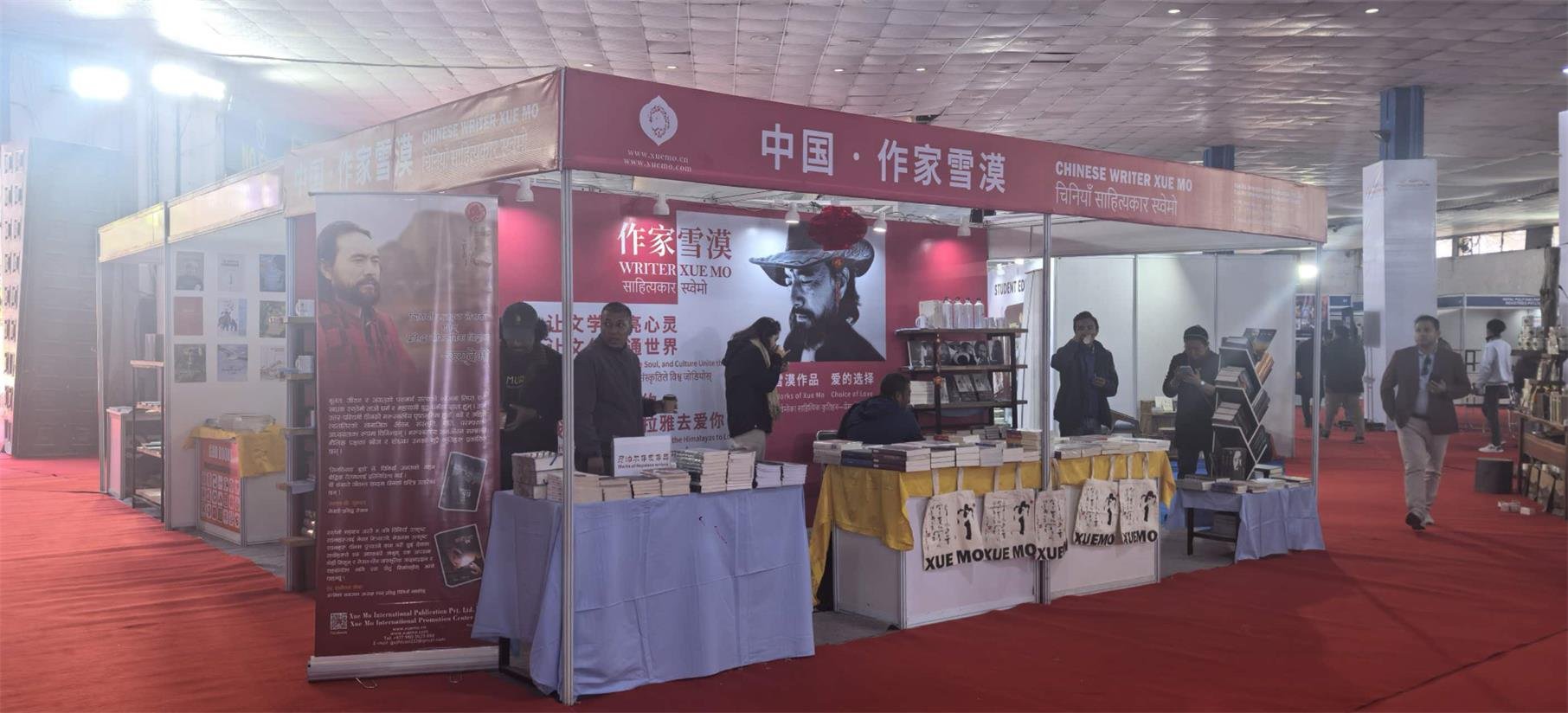 值得一提的是,本次参展还首次增设了“雪漠文创产品”专区,展示了包括创意旅行壶、水杯、餐盘、丝巾、笔记本等在内的多种文创产品,为到访的读者呈现了一个直观、立体的雪漠形象。这些文创产品旨在传播雪漠先生所倡导的“一书三品两文化”思想,并在尼泊尔、印度、斯里兰卡等南亚地区产生影响。它们受到了尼泊尔民众的广泛喜爱和关注。