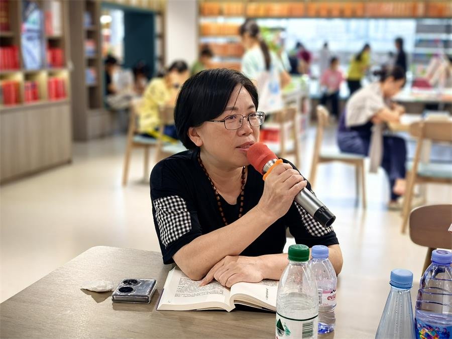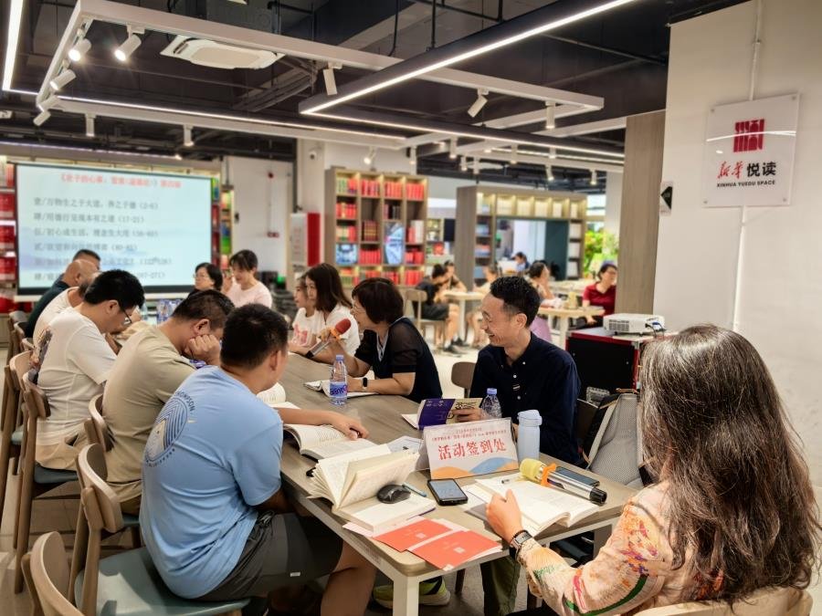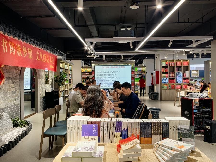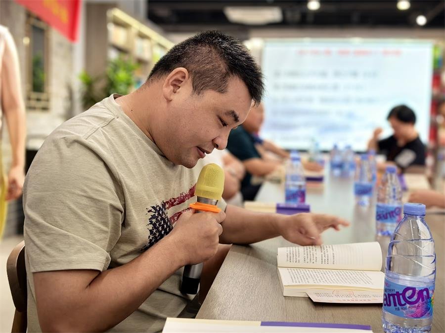 2025629日,惠州读书会第三十期共读暨赠书活动在惠州新华购书中心二楼如期举行。连日暴雨恰好在周日放晴,为活动增添了几分明媚。现场布置一新,投影幕上循环播放着雪漠老师的作品介绍,吸引了众多读者驻足关注,不少人现场咨询如何加入读书会。在专柜展示区,一位读者拿起《老子的心事:雪煮<道德经>》(雪漠 著),旁若无人地放声朗读,沉浸其中——经典与爱书人的同频共振,在此刻生动展现。