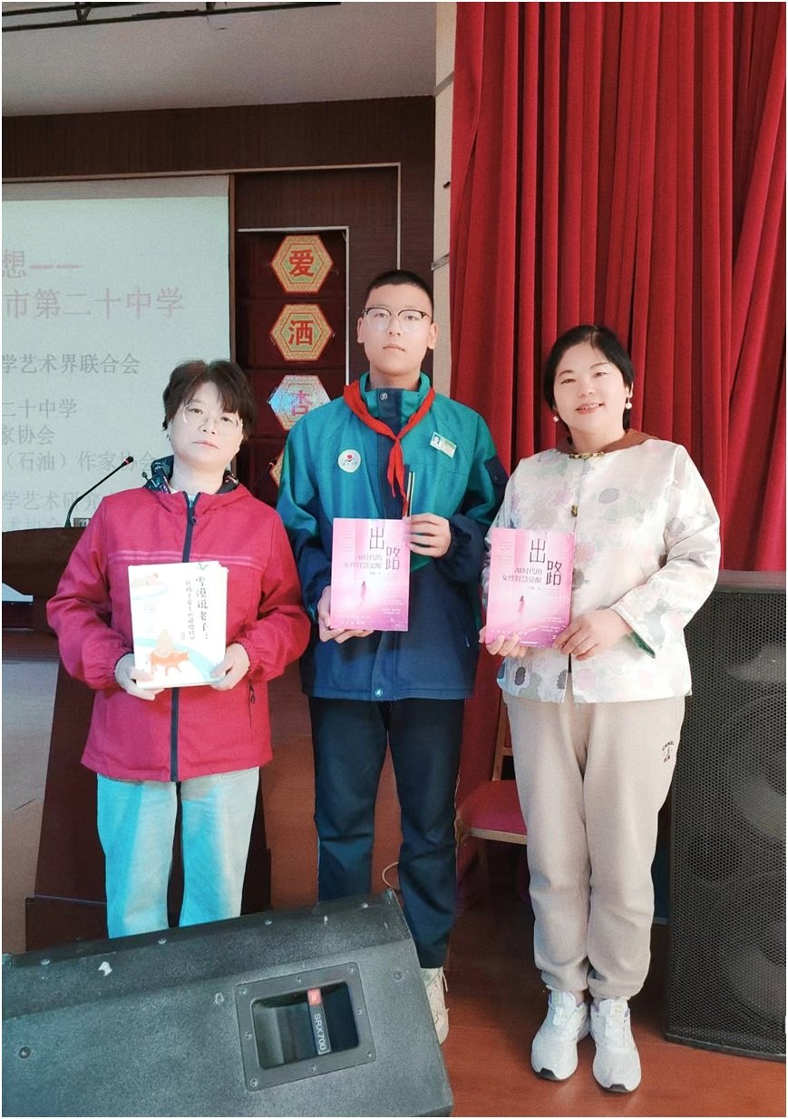 雪漠西域文化艺术研究中心在此次活动中展现出积极的文化担当。文研中心读书会的胡薇、周宏、史丽萍与巴州朗诵艺术协会联袂登台,深情朗诵诗人申广志《石油季节》中的代表作,将石油工人的坚韧与情怀娓娓道来。申广志在分享中勉励学生:“要勤于观察生活,让写作成为表达情感的方式。”