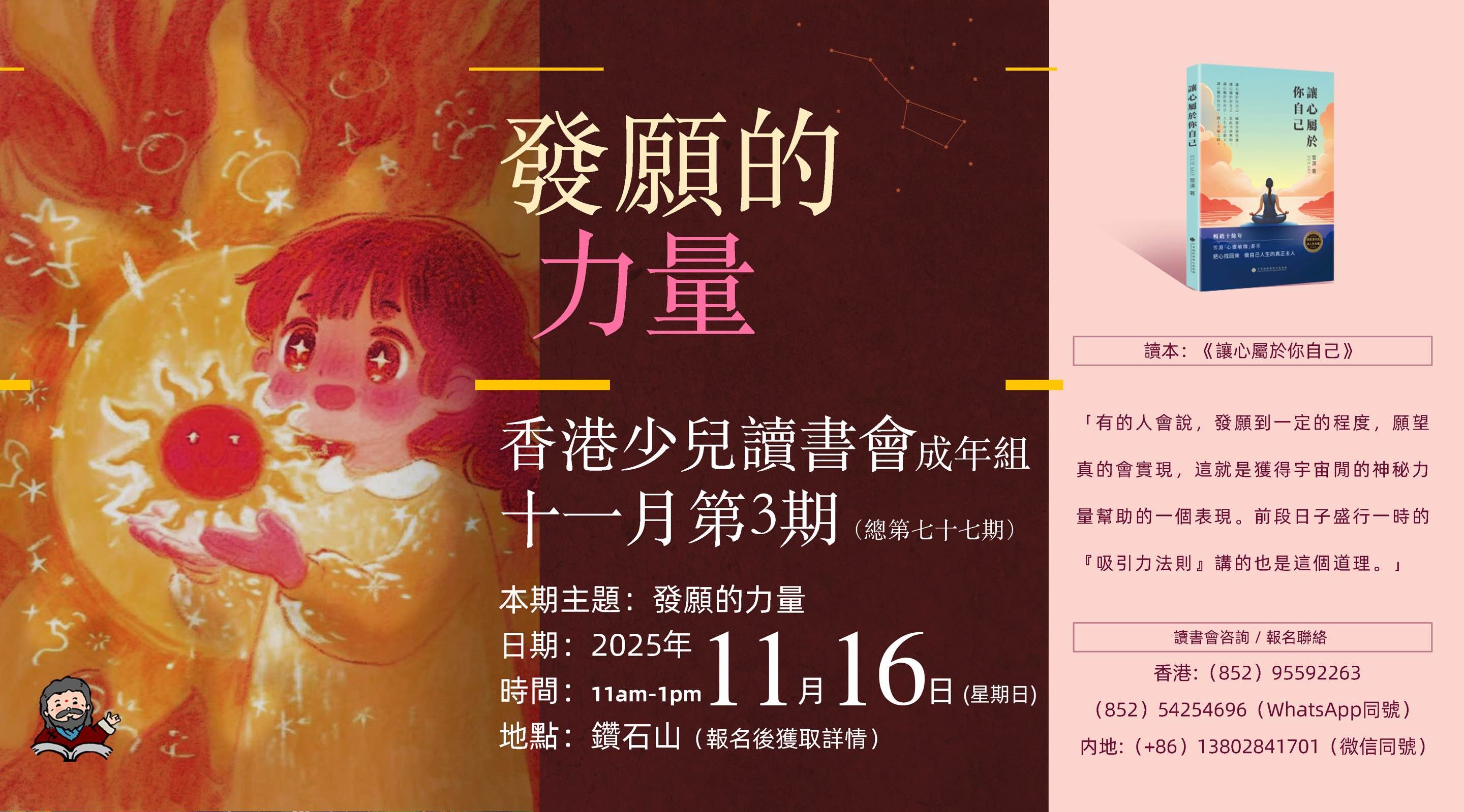 2025119日,香港少儿读书会·成人组十一月第二期活动在星河明居会所如期举办。本期读书会以“永远把眼前的事做好”为主题,继续围绕《让心属于你自己》一书展开了深入的讨论与交流。