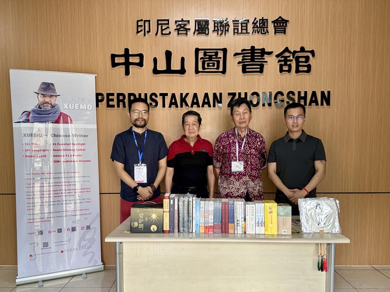 展期四天,我们的“任务”远不止于“摆摊”:波哥和泽贤老师带着书籍,奔波三日走访当地的文化传播机构,将《世界是心的倒影》《雪漠小说精选》等十余本书赠予对方。谈及文化传播理念时,机构负责人紧握他们的手说:“我们需要这样有温度的中国作品。”他们还拜访了国立大学中文系的教授及相关负责人,捐赠了部分书籍。当谈及“希望未来能合作翻译雪漠老师的作品”时,教授激动地表示:“这能让印尼学生更直观地感受中国哲学的魅力。”更令人惊喜的是,我们在展会上结识了中山图书馆年逾七旬的童靖程老师。他不仅自己购买了雪漠的作品,还主动帮助我们对接当地图书馆,促成了十余本中文书籍的捐赠,让文化的种子得以更深地扎根。
