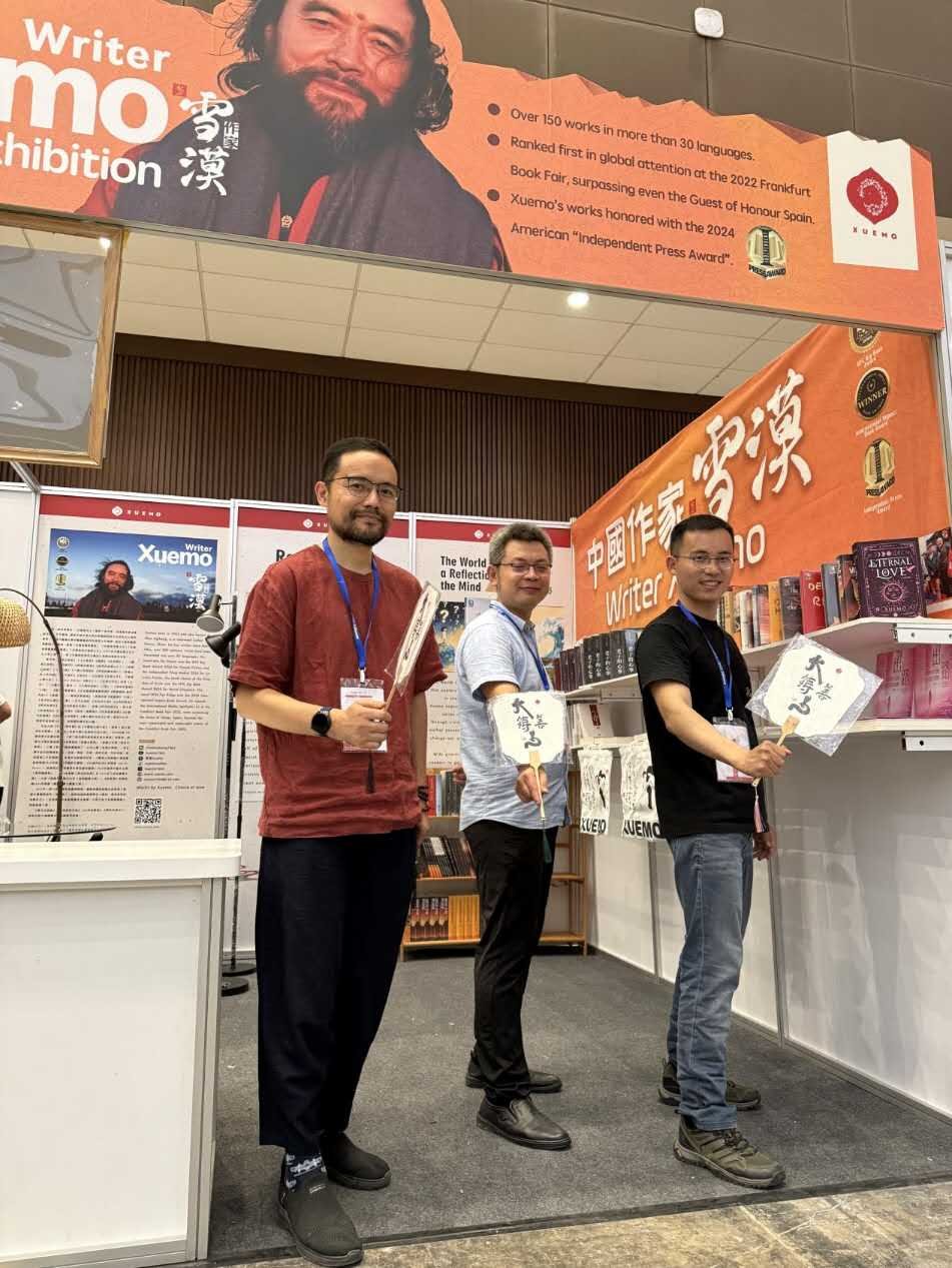 开展第一天,橙色背景板上“中国作家雪漠”几个字刚刚立起,便吸引了一圈人驻足。一位做建材生意的老板指着《爱不落下》笑道:“建筑是盖房子,你们这书是‘盖心的房子’?”我们顺势解释道:“在中国文化里,‘家’不仅是物理空间,更是心灵的港湾。这本书讲述的正是如何用爱构筑内心的家园。”他听完,立刻拍照记录,并当场购买了两本,说“要寄给我学中文的女儿,让她多了解中国的家文化”。一位中文专业的学生蹲在展台前翻阅《世界是心的倒影》,突然指着“心变则境变”的句子说:“这和我们爪哇族的‘内心平和则生活平和’是一样的道理!”——那一瞬间,我们忽然明白:文化的共鸣,从来不需要完美的翻译,只需要一颗愿意靠近和理解的心。