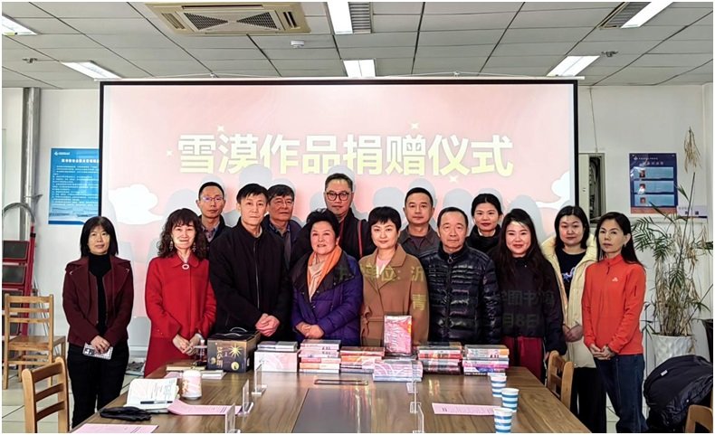 上午9时40分,捐赠仪式正式开始,由青岛科技大学图书馆副馆长张岩主持。青岛科技大学图书馆党委书记、馆长闫业海致欢迎辞,他对沂山书院的爱心之举表示诚挚感谢,并指出,优质图书的捐赠是对学校文化建设的有力支持,将为师生提供更丰富的阅读资源,助力汉语国际推广与中国文化传播。程剑女士在致辞环节,结合自身经历分享了阅读雪漠作品的感悟。她谈到,雪漠的文字不仅饱含深厚的文化底蕴,更蕴藏着启迪心灵的力量,自己在阅读过程中,收获了精神的成长与内心的丰盈,也愈发坚定了传播优秀文化、践行公益的决心。随后,沂山书院兰老师详细介绍了雪漠作品的创作特色与文化价值,让在场人员对这批图书有了更深入的了解。中国海洋大学退休教授王教授也受邀进行分享。仪式的核心环节,沂山书院向青岛科技大学图书馆捐赠134套共计178册雪漠作品集。程剑代表沂山书院递交捐赠图书清单,闫业海馆长代表学校接受捐赠,并向程剑颁发捐赠证书,双方合影留念,定格下这一意义非凡的时刻。闫业海馆长在总结讲话中强调,图书馆将妥善保管、高效利用这批图书,让雪漠作品中的文化智慧惠及更多师生,推动校园形成爱读书、读好书、善读书的浓厚氛围。