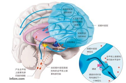 在复杂的大脑结构中,前额叶皮层所处的特殊位置决定了它对压力具有很强的敏感性。它是大脑中进化最完全的区域,占了人类大脑皮层的三分之一,这个比例高于其他任何灵长类动物。前额叶皮层的成熟过程也比其他大脑区域缓慢,青春期后才能发育完全。这个区域包含许多负责抽象思维的神经回路,能使我们集中注意力,坚持完成工作任务,同时将信息储存在我们的工作记忆里。由于储存了短时工作记忆,我们在做加法运算时,前额叶皮层可以帮助我们记住上一步运算结果。而作为一个心理活动的控制单元,前额叶皮层还能抑制不适宜的想法和行动。