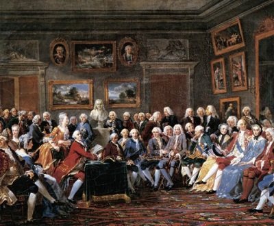 18世纪,法国乔弗朗夫人的文艺沙龙情景。在场的人中有哲学家卢梭、阿朗贝尔、朱利叶•德•莱斯皮纳斯等