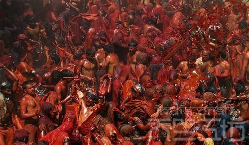 我跑到大街上,只见男女老幼都已是一身重彩,平日腼腆的姑娘们也互相嬉闹着,卷入了“色彩之战”。